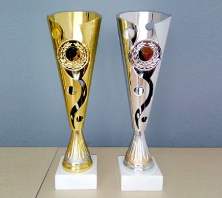 Pehari od 33 cm u zlatnoj i srebrnoj varijanti pogodni za dodelu pojedincima ili organizacijama. Na peharu postoji mesto za aplikaciju (umetak) nekog od sportskih disciplina ili personalizovan logotip, veličina prečnika 2,5 cm.