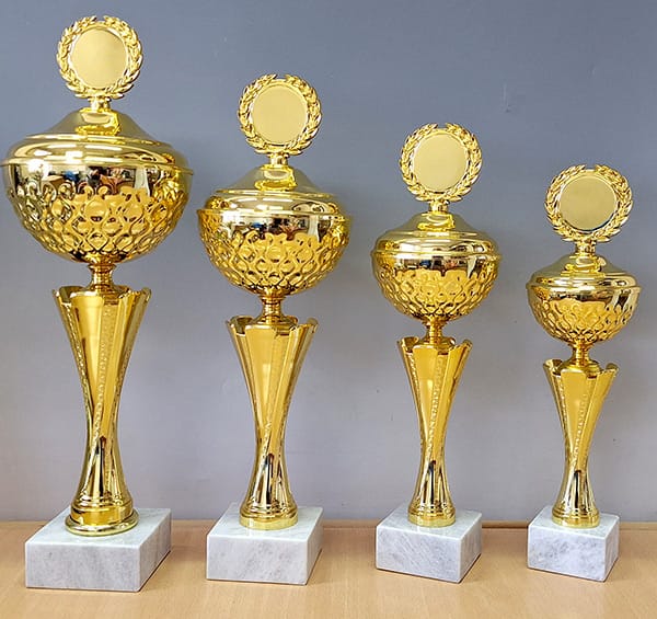 Pehari u zlatnoj boji sa metalnom čašom i poklopcem.