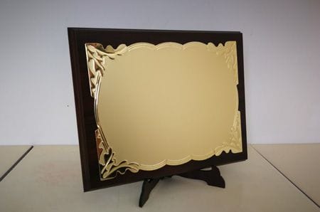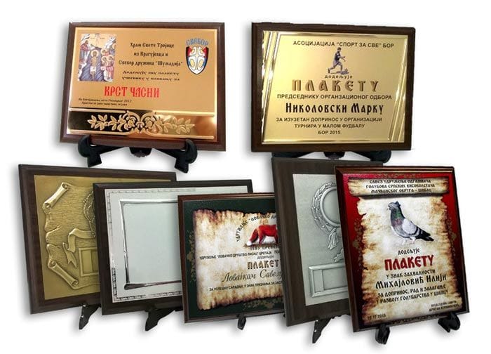 Plaketa na čvrstom abs držaču sa drvenom podlogom i alu zlatnom/srebrnom pločom. U cenu plakete je uračunata štampa
