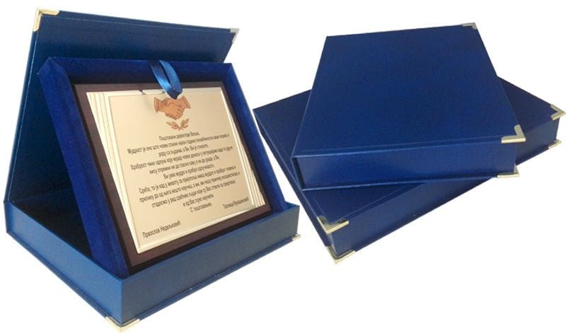 Luksuzna plaketa u royal plavoj čvrstoj kutiji sa alu zlatnom pločom na drvenoj podlozi. Štampa u boji je uračunata u cenu plakete.