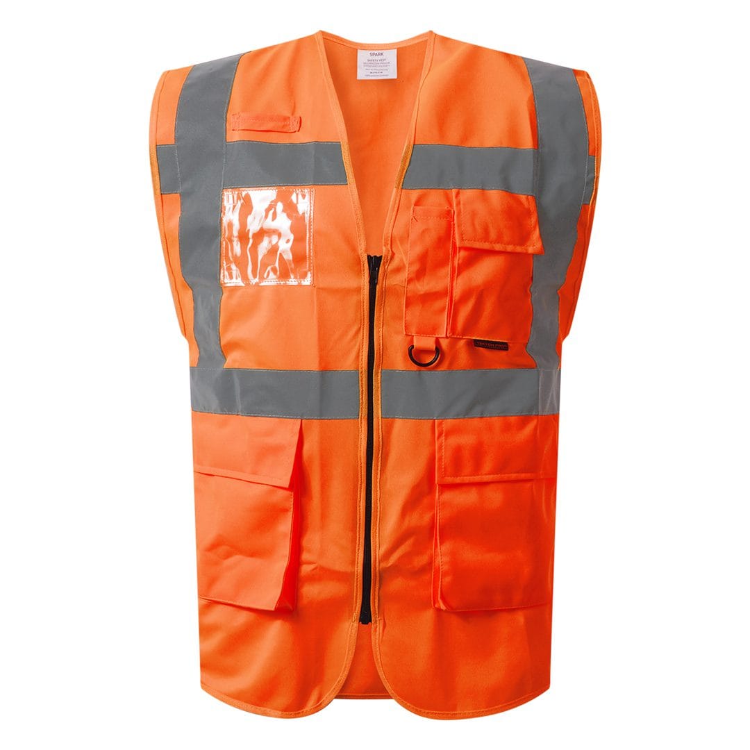 Prsluk, fluorescentni, dve reflektivne trake napred, dve pozadi i jedna preko ramena, četiri prednja džepa, džep za mobilni telefon i olovku, plastični uložak za ID karticu, plastična gajka za ključeve i gajka za slušalice